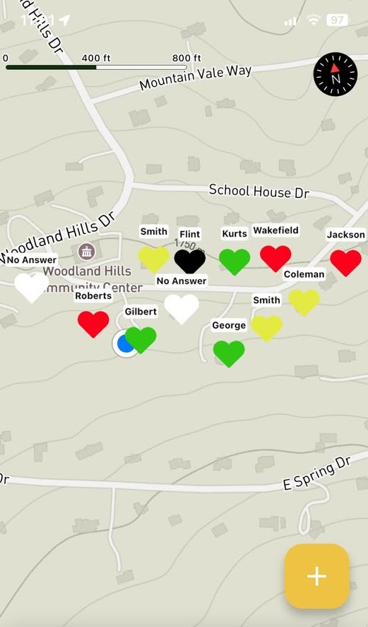 “This is a screenshot of the RDAP Pro software showing the status of each house in a community. Green hearts mean the family is ok. Blue hearts mean they are evacuated. Red hearts mean there is a serious injury. Black heart means someone died. White hearts mean no one answered the door.